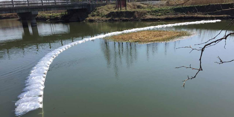 Barreras flotantes conectables, esenciales para contener y absorber derrames en cuerpos de agua.